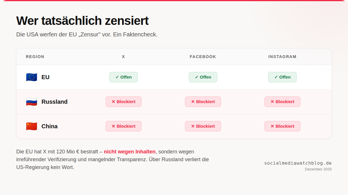 - Genau wie Musk verloren Rubio, Vance, Cruz und Carr kein Wort über Russland, das neben X auch Facebook, Instagram und weitere US-Dienste sperrt. Die Regierung von Wladimir Putin zensiert Medien und Plattformen. Zensurvorwürfe erheben die USA aber hauptsächlich gegen die EU und China.